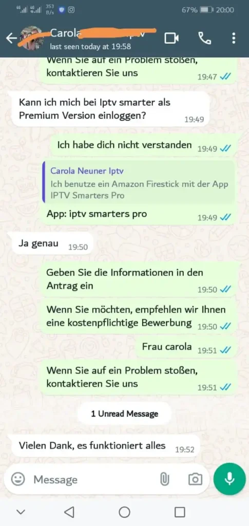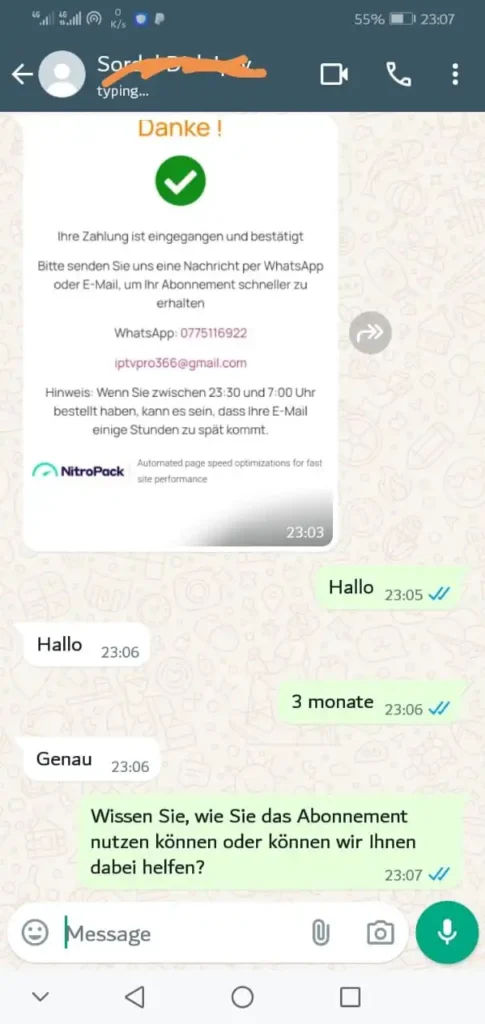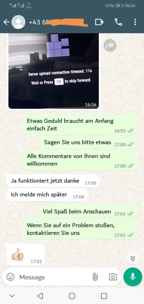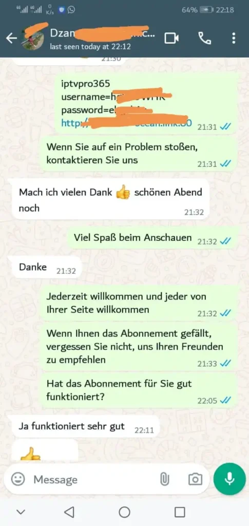 Nach dem Kauf senden wir Ihre Zugangsdaten inklusive m3u listen aktuell direkt per E-Mail. Der Setup dauert nur 15–30 Minuten. Bei Fragen hilft unser WhatsApp-Support sofort weiter.
